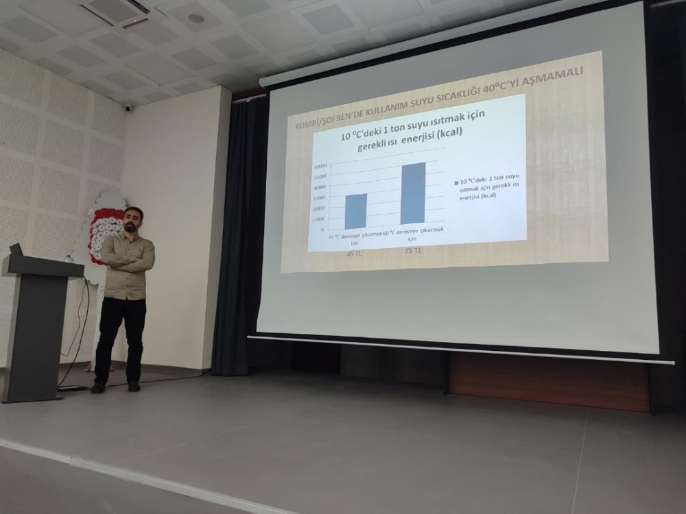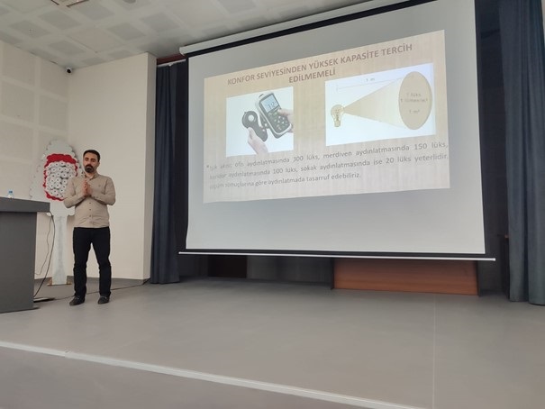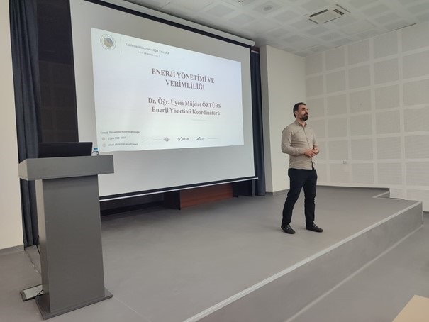Koordinatörümüz Dr. Öğr. Üyesi Müjdat Öztürk, enerjiyi verimli ve tasarruflu kullanmanın önemine vurgu yaparak, gereksiz yanan bir lambanın bile söndürülmesinin milli bir sorumluluk olduğunu ifade etmiş ve sunumunu soru-cevap bölümüyle tamamlamıştır.