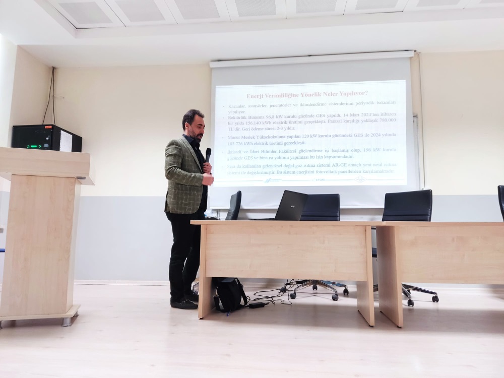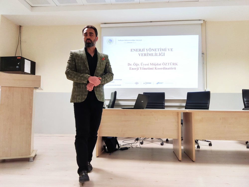 Koordinatörümüz Dr. Öğr. Üyesi Müjdat Öztürk, enerjiyi verimli ve tasarruflu kullanmanın önemine vurgu yaparak, gereksiz yanan bir lambanın bile söndürülmesinin milli bir sorumluluk olduğunu ifade etmiş ve sunumunu soru-cevap bölümüyle tamamlamıştır.