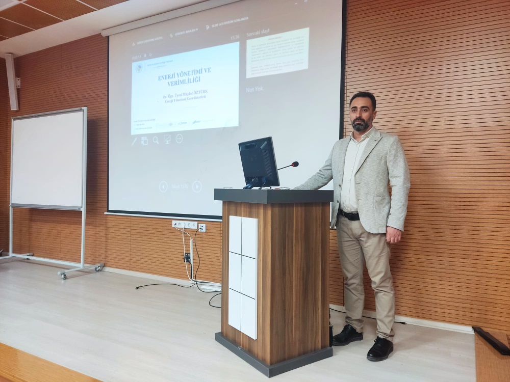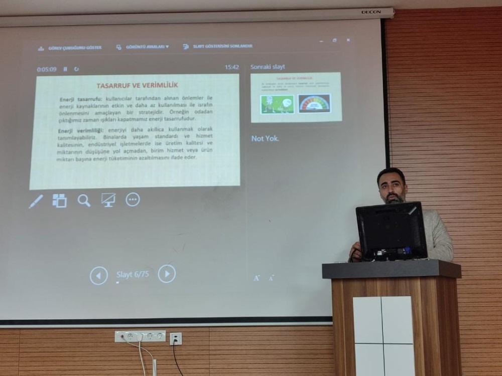 Koordinatörümüz Dr. Öğr. Üyesi Müjdat Öztürk, enerjiyi verimli ve tasarruflu kullanmanın önemine vurgu yaparak, gereksiz yanan bir lambanın bile söndürülmesinin milli bir sorumluluk olduğunu ifade etmiş ve sunumunu soru-cevap bölümüyle tamamlamıştır.