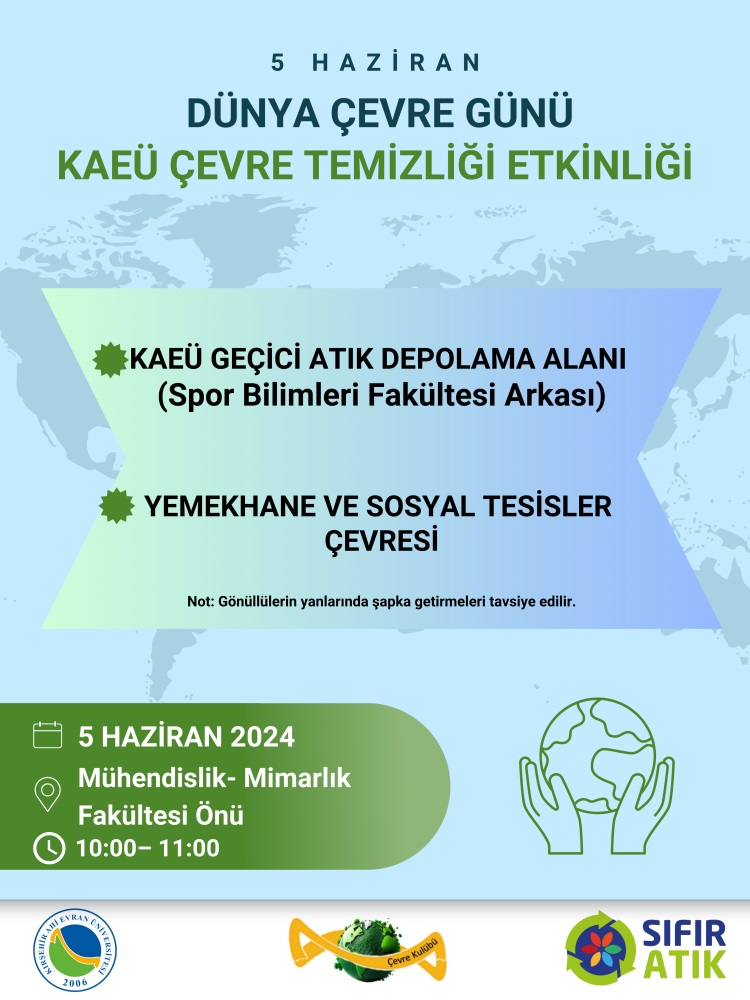 Üniversitemizin Çevre ve Enerji Yönetim Komisyonu ve Sıfır Atık Komisyonu ile Mühendislik-Mimarlık Fakültesi işbirliği ile 5 Haziran Dünya Çevre Günü Etkinliği düzenlenecektir.