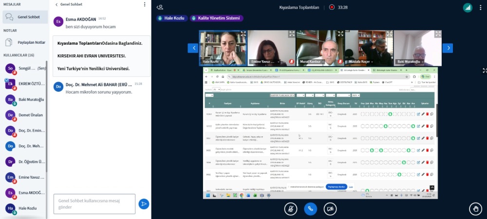 Erciyes Üniversitesi’nden ise Kalite Koordinatörü Doç. Dr. Hale Kozlu, Koordinatör Yardımcıları Dr. Öğr. Üyesi İmdat Orhan ve Dr. Öğr. Üyesi Emine Yavuz Harman, Öğr. Gör. Baki Muratoğlu ile Esma Akdoğan’ın yanı sıra Prof. Dr. Mustafa Koçer, Prof. Dr. Murat Kambur ve Prof. Dr. Demet Ünalan toplantıda yer aldı.