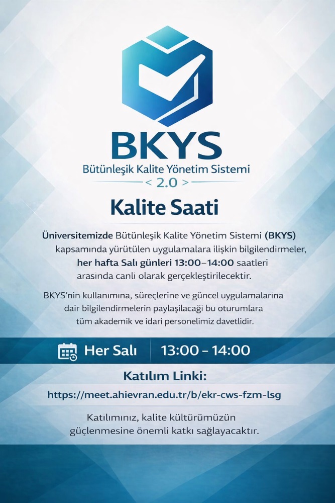 Kalite Saati oturumlarında; Üniversitenin kalite güvence sistemi, İSO Standartları, EFQM Modeli ve BKYS’nin kullanımı, süreçleri ile güncel uygulamalarına ilişkin bilgilendirmeler paylaşılacak, katılımcıların soruları yanıtlanacaktır. Canlı olarak gerçekleştirilecek bu oturumlar, kalite yönetim sistemine ilişkin farkındalığın artırılmasını ve uygulamaların etkinliğinin güçlendirilmesini hedeflemektedir.