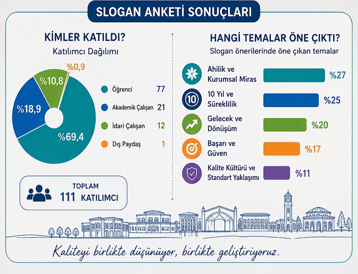 Slogan önerileri incelendiğinde, birkaç temanın öne çıktığı görülmektedir. Öne çıkan temalar içerisinde Ahilik ve kurumsal miras, 10 yıllık kalite birikimi ve süreklilik, gelecek ve güven, başarı ve sürdürülebilirlik ile kalite kültürü yer almaktadır. Katılımcılar tarafından sunulan sloganlarda, üniversitenin köklü değerleri ile kalite anlayışının birlikte ele alındığı dikkat çekmektedir.