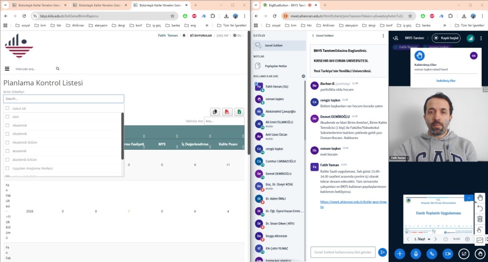 Kilis 7 Aralık Üniversitesi, Bütünleşik Kalite Yönetim Sistemi (BKYS)’ni kullanan üniversiteler arasına katıldı. Bu kapsamda üniversitenin BKYS kullanıcılarına yönelik eğitim programı gerçekleştirildi.