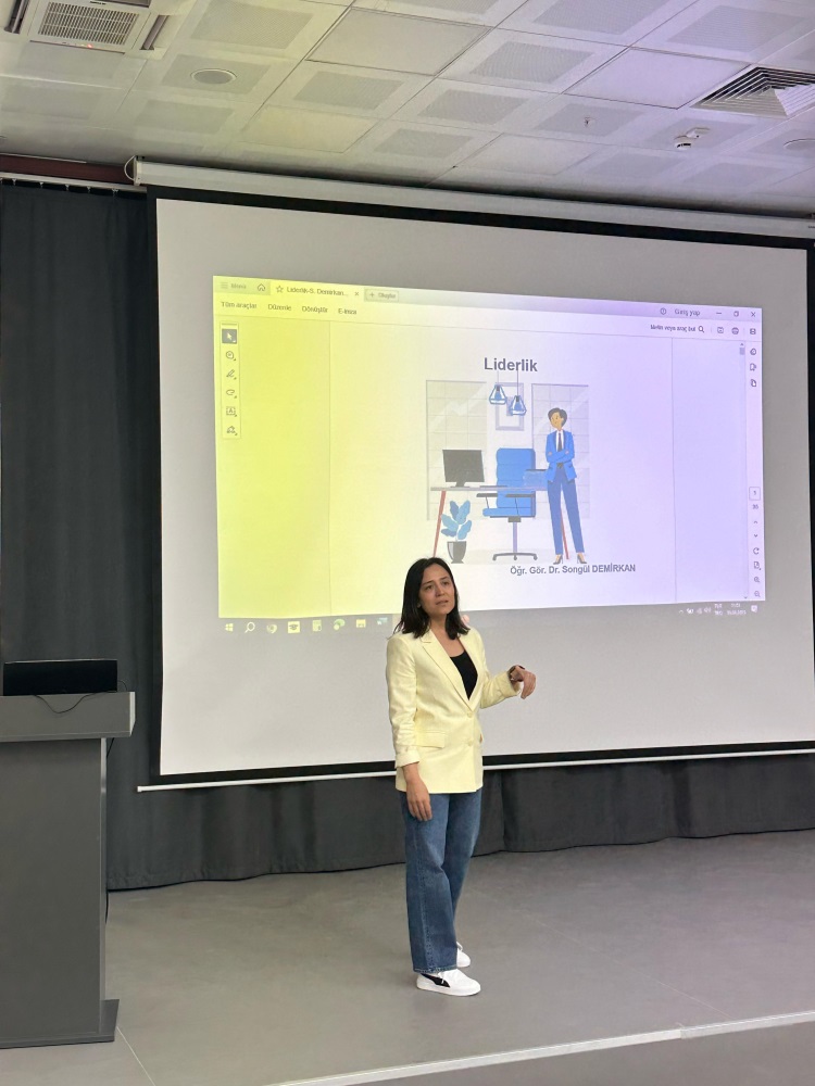 Etkinliğin ikinci bölümünde ise Öğr. Gör. Dr. Songül Demirkan “Liderlik ve İletişim” konulu sunumuyla sahnedeydi. Dr. Demirkan, etkili iletişim becerilerinin ve çağdaş liderlik anlayışının hem bireysel kariyer gelişiminde hem de kurumsal hedeflerin gerçekleştirilmesinde kritik bir rol oynadığını belirtti. Katılımcılar, liderliğin doğuştan gelen değil; öğrenilebilir ve geliştirilebilir bir yetkinlik olduğunu, bu tür eğitimlerin bireyleri hem özel hem de profesyonel yaşamda öne çıkaracağını öğrendi.