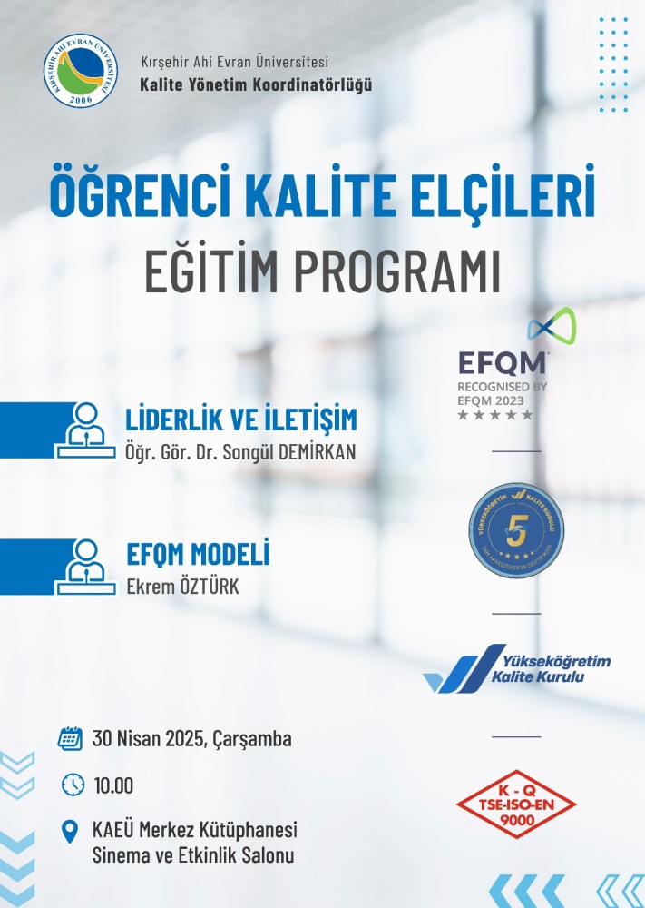 Kırşehir Ahi Evran Üniversitesi, kalite anlayışını genç nesillere aktarmak ve liderlik becerilerini geliştirmek amacıyla önemli bir eğitim programına ev sahipliği yaptı. Kalite Yönetim Koordinatörlüğü bünyesinde faaliyet gösteren Öğrenci Kalite Elçileri ve Genç Kalite Topluluğu tarafından organize edilen “Liderlik ve İletişim Eğitimi” ile “EFQM Modeli Eğitimi”, yoğun katılımla gerçekleştirildi.