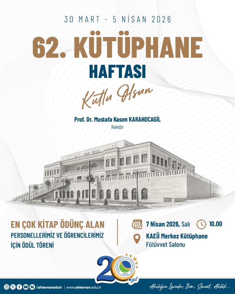 Bu yıl "İyileştiren Kütüphaneler" ana temasıyla kutlanan 62.Kütüphane Haftası ve üniversitemizin 20. kuruluş yılı doğrultusunda, Merkez Kütüphane Fütüvvet Salonunda düzenlenecek program kapsamında aktif kullanıcılarımız arasında yer alıp merkez kütüphaneden en çok ödünç kitap alan 1 Akademik ve İdari Personelimiz ile 3 öğrencimize belge ve ödül verilecektir. Ayrıca personelimize belge verilmesi ve Sosyal Sorumluluk Projesi kapsamında merkez kütüphane koleksiyonun geliştirilmesi adına çalışmalar yürüten akademik personelimiz ile öğrencilerimize plaket takdimi olacaktır.