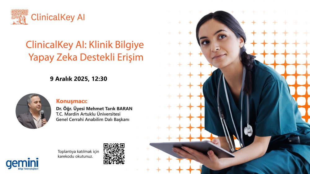 İhtiyacınız olan klinik bilgiye kısa zaman içerisinde erişebileceğiniz klinik arama motoru Elsevier ClinicalKey veri tabanının yapay zeka ile güçlendirilmiş yeni çözümü ClinicalKey AI veri tabanı ile ilgili düzenlenecek olan online bilgilendirme toplantısına davetlisiniz. Düzenlenecek toplantıda, sağlıkta yapay zeka uygulamaları ve ClinicalKey AI kullanımına ilişkin önemli bilgiler konuşmacı Dr. Öğr. Üyesi Mehmet Tarık BARAN tarafından paylaşılacaktır.
