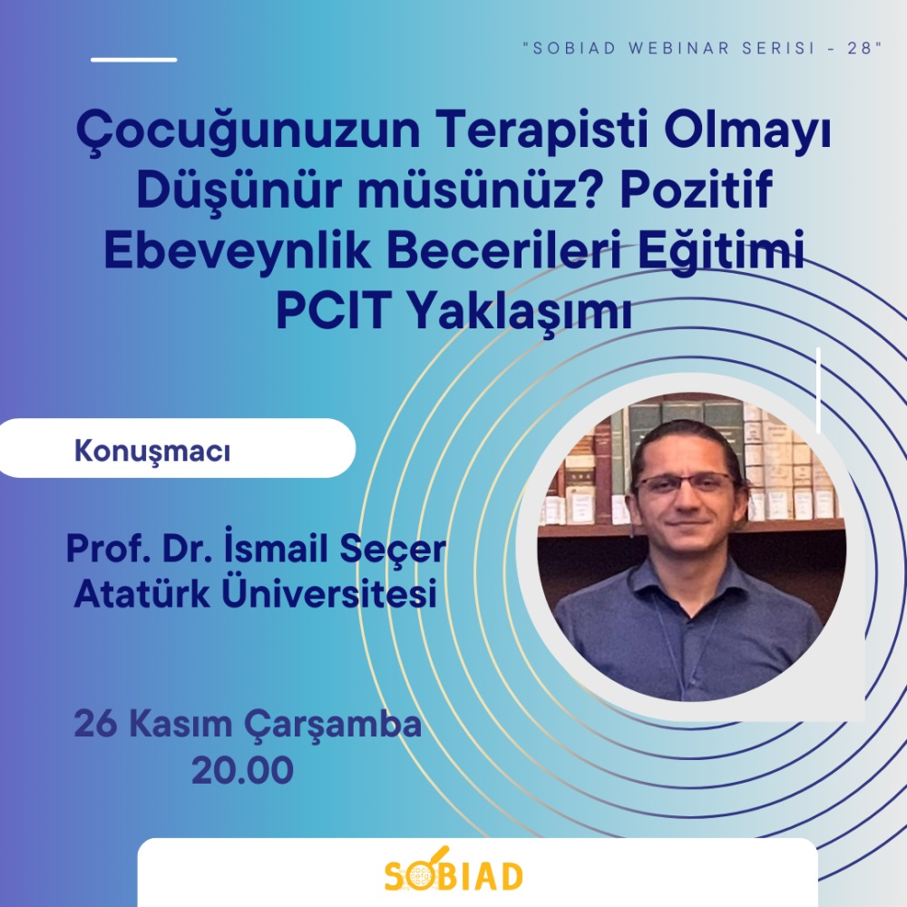 Sobiad Atıf Dizini tarafından düzenlenen Sobiad Akademi Webinar Serisi - 28'de, Prof. Dr. İsmail Seçer’in konuşmacı olarak katılacağı “Çocuğunuzun Terapisti Olmayı Düşünür müsünüz? Pozitif Ebeveynlik Becerileri Eğitimi PCIT Yaklaşımı” konulu seminer düzenlenecektir. Seminere ait bilgiler aşağıda yer almaktadır.