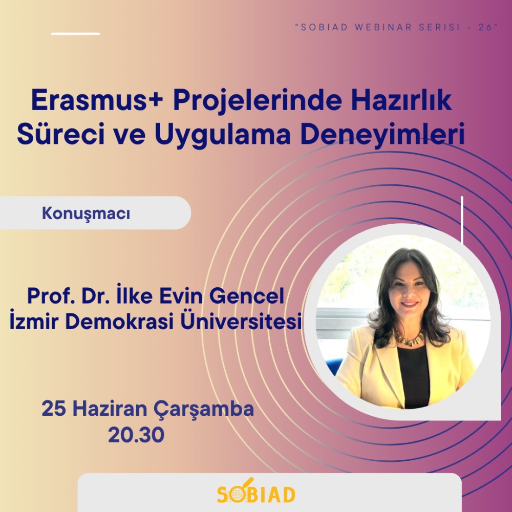 Sobiad Atıf Dizini tarafından düzenlenen Sobiad Akademi Webinar Serisi - 26'da, Prof. Dr. İlke Evin Gencel'in konuşmacı olarak katılacağı “Erasmus+ Projelerinde Hazırlık Süreci ve Uygulama Deneyimleri” konulu seminer düzenlenecektir. Seminere ait bilgiler aşağıda yer almaktadır.