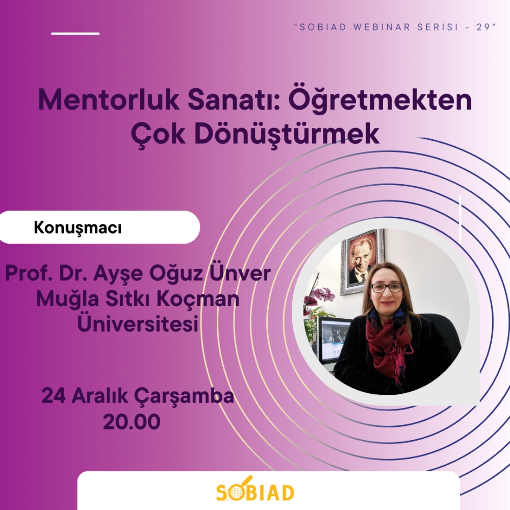 Sobiad Atıf Dizini tarafından düzenlenen Sobiad Akademi Webinar Serisi - 29'da, Prof. Dr. Ayşe Oğuz Ünver’in konuşmacı olarak katılacağı ''Mentorluk Sanatı: Öğretmekten Çok Dönüştürmek'' konulu seminer düzenlenecektir. Seminere ait bilgiler aşağıda yer almaktadır.
