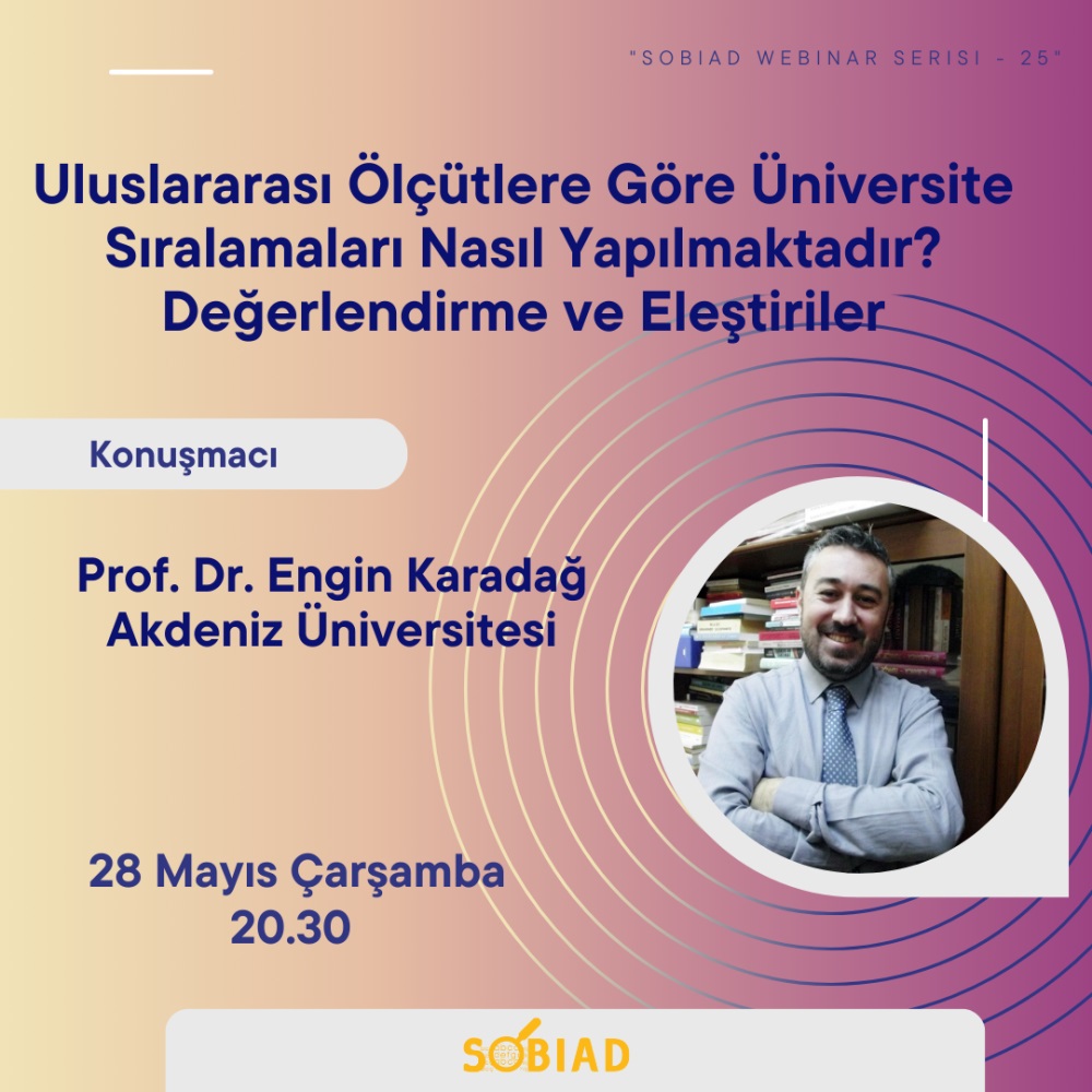 Sobiad Atıf Dizini tarafından düzenlenen Sobiad Akademi Webinar Serisi - 25'te, Prof. Dr. Engin Karadağ'ın konuşmacı olarak katılacağı 'Uluslararası Ölçütlere Göre Üniversite Sıralamaları Nasıl Yapılmaktadır? Değerlendirme ve Eleştiriler'' konulu seminer düzenlenecektir. Seminere ait bilgiler aşağıda yer almaktadır.