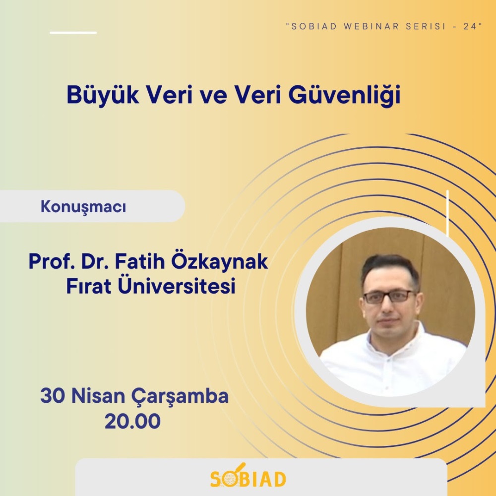 Sobiad Atıf Dizini tarafından düzenlenen Sobiad Akademi Webinar Serisi - 24'te, Kriptoloji Uzmanı Prof. Dr. Fatih Özkaynak'ın konuşmacı olarak katılacağı ''Büyük Veri ve Veri Güvenliği'' konulu seminer düzenlenecektir. Seminere ait bilgiler aşağıda yer almaktadır.