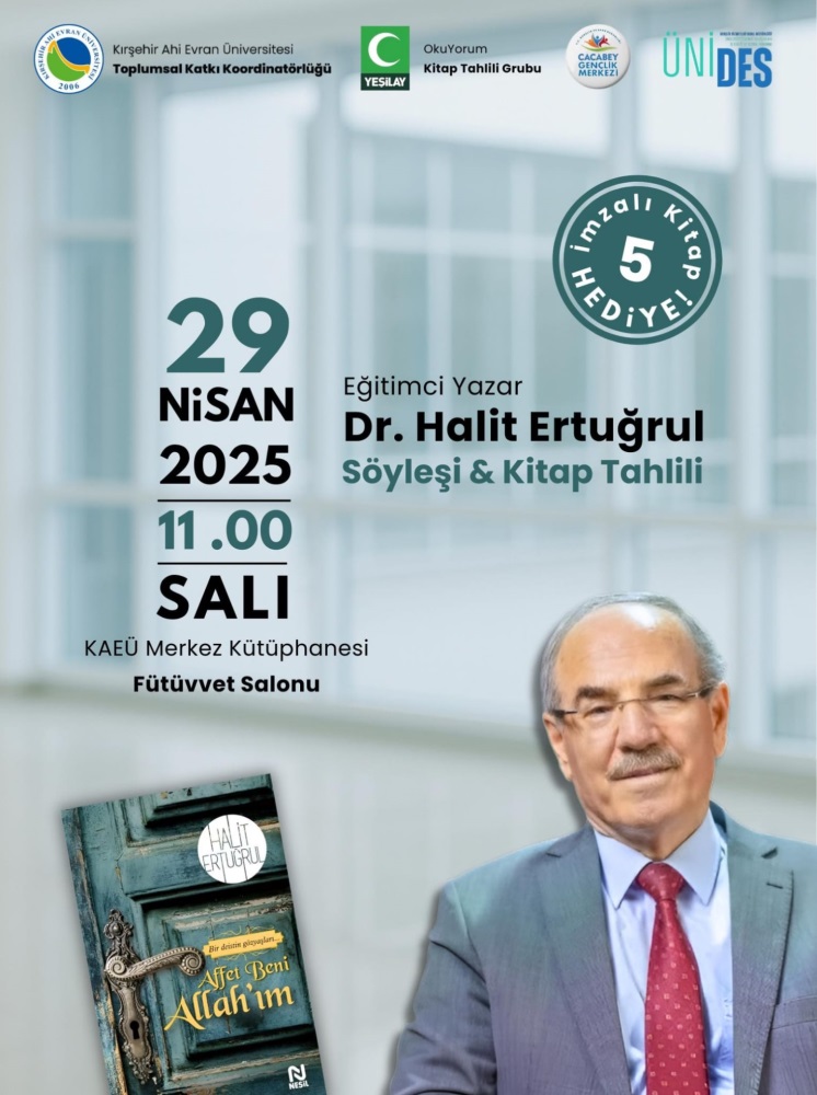 Kırşehir Ahi Evran Üniversitesi Kütüphane ve Dokümantasyon Daire Başkanlığı olarak Merkez Kütüphane Fütüvvet Salonunda Yeşilay Kırşehir Şubesi Gençlik Komisyonu tarafından düzenlenen ve Toplumsal Katkı Koordinatörlüğü tarafından desteklenen " Ayda 1 Kitap 1 Tahlil " programı gerçekleştirildi. Program kapsamında Nisan ayı kitap tahlili için eğitimci yazar Dr. Öğr. Üyesi Halit Ertuğrul'u misafir ettik.