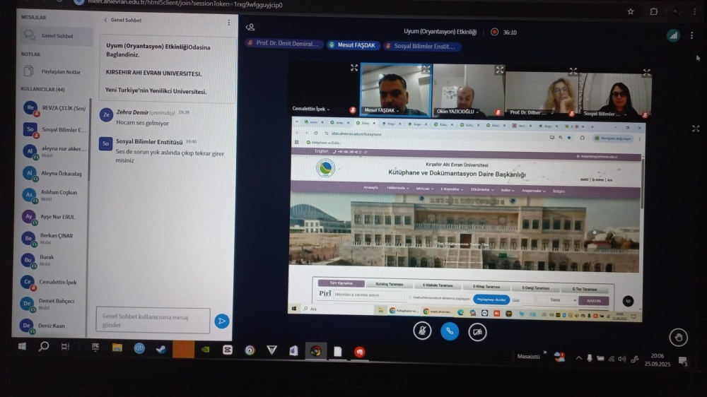 Üniversitemiz Enstitüleri (Fen Bilimleri Enstitüsü, Sağlık Bilimleri Enstitüsü ve Sosyal Bilimler Enstitüsü)'ne 2025-2026 Eğitim-Öğretim Yılı Güz Döneminde kayıt yaptıran öğrencilere yönelik 25 Eylül 2025 Perşembe günü saat 19.30'da çevrimiçi olarak gerçekleştirilen oryantasyon (uyum) programına birimimiz adına katılım sağlayan Kütüphaneci Mesut FAŞDAK tarafından “Kütüphane Tanıtımı ve Basılı - Elektronik Kaynakların Kullanımı Eğitimi” konularında eğitim verildi.