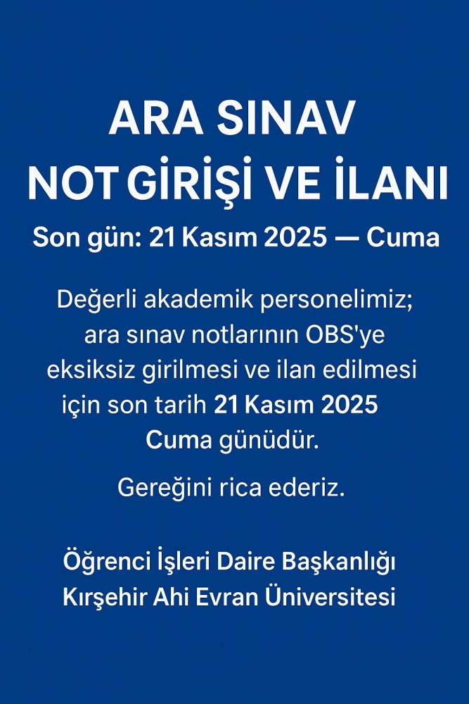 2025–2026 Eğitim-Öğretim Yılı Güz Yarıyılı ara sınavlarına ilişkin not girişlerinin öğrenci bilgi sistemine (OBS) girilmesi ve ilan edilmesi için Akademik Takvimde belirtilen son tarih 21 Kasım 2025 Cuma günü olarak belirlenmiştir.