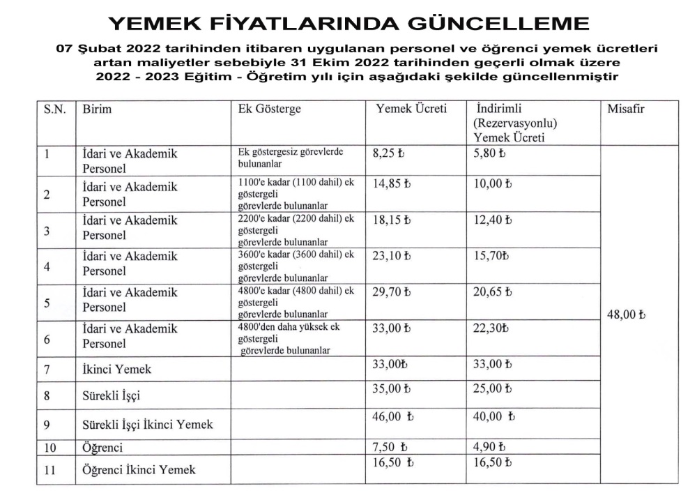 Yemek Fiyatlarında Güncelleme Yapılmıştır