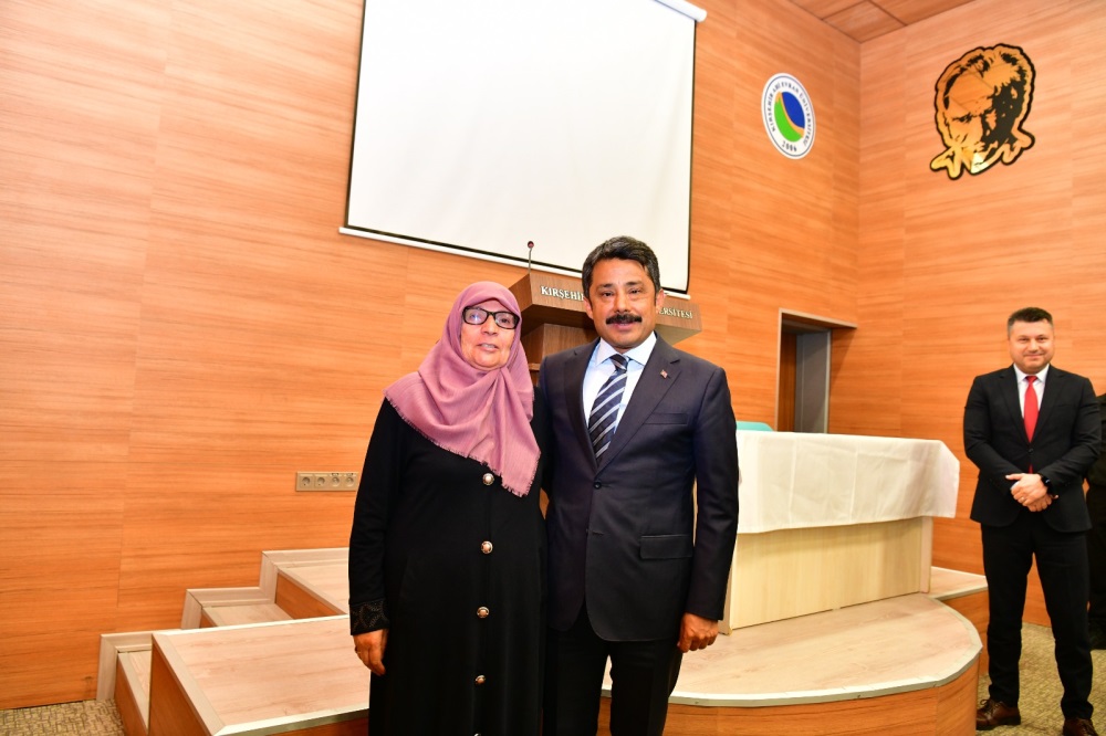 Sunumun ardından Kırşehir Valisi Murat Sefa Demiryürek, öğrencilerle sohbet ederek meslek hayatında yaşadığı anılardan örnekler paylaştı. Vali Demiryürek, Kırşehir’in eğitime verdiği değeri vurgularken, eğitimin yaş sınırı olmadığını da sözlerine ekledi. Programın sonunda Vali Demiryürek, Rektör Prof. Dr. Mustafa Kasım Karahocagil ve Kırşehir Aile ve Sosyal Hizmetler İl Müdürü Serkan Sağlam, öğrencilerle birlikte hatıra fotoğrafı çektirdi.