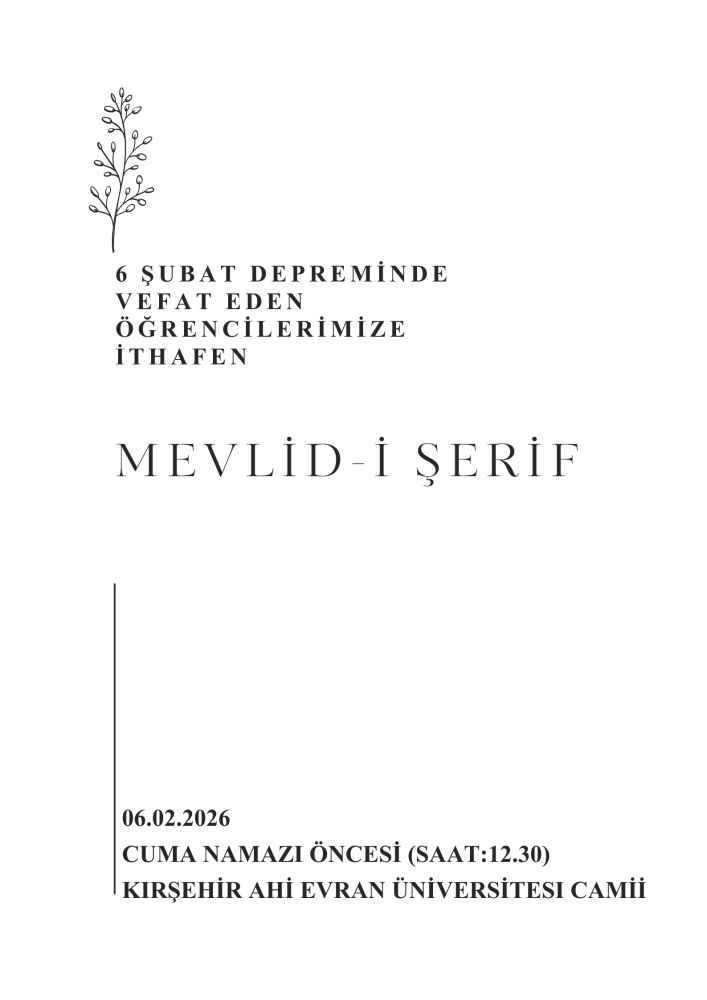 6 Şubat 2023 tarihinde meydana gelen ve ülkemizi derinden sarsan Kahramanmaraş merkezli depremlerde hayatını kaybeden öğrencilerimiz anısına üniversitemizde mevlid programı düzenlendi. Büyük bir hüzün ve saygı atmosferinde gerçekleştirilen programda, deprem felaketinde yaşamını yitiren öğrencilerimiz dualarla anıldı.