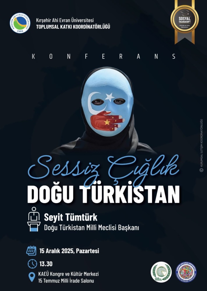 Güçlü bir medeniyet birlikteliğimiz bulunan Doğu Türkistan’da insani hakların yok sayıldığı uygulamalar yaşanmaktadır. Bu haksızlığa dikkat çekmek, Doğu Türkistan’dan yükselen sessiz çığlığı duyurmak ve kamuoyunu bilgilendirmek amacıyla üniversitemizde bir konferans düzenlenecektir.
