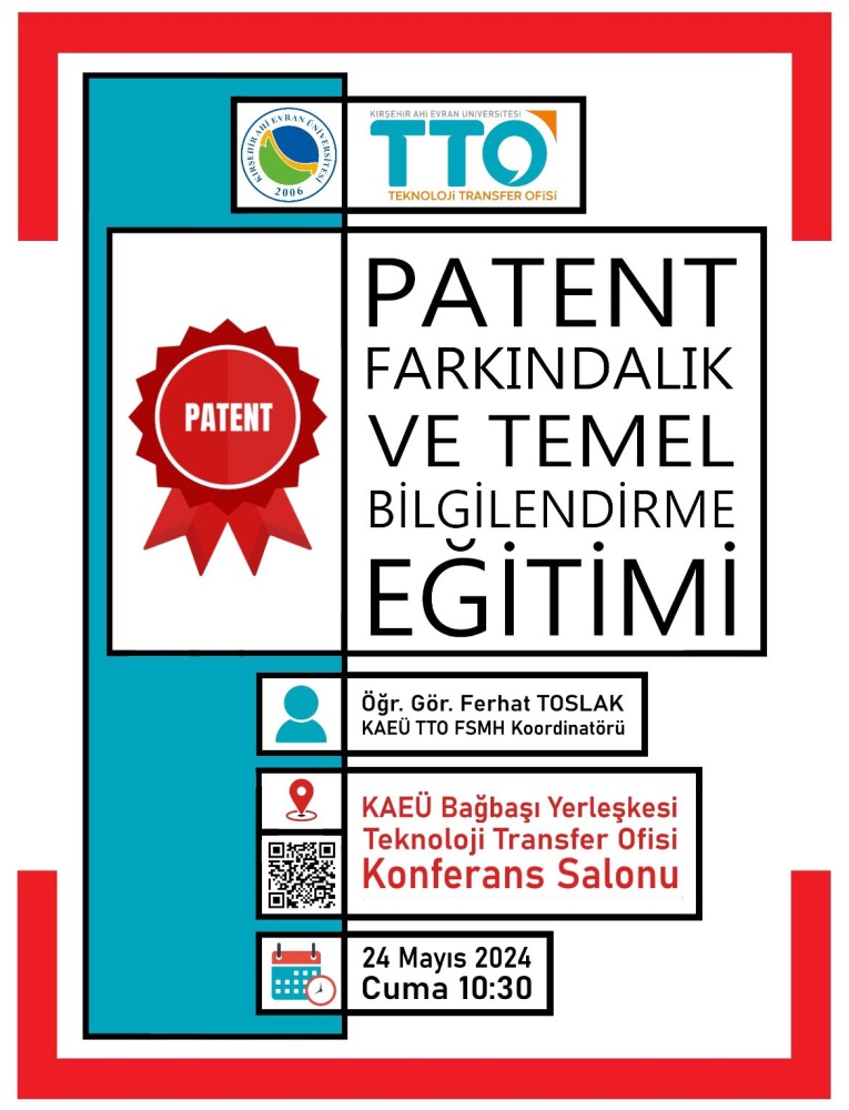 "Fikri ve Sınai Haklar" ve "Farkındalık ve Eğitim" modül çalışmaları kapsamında Teknoloji Transfer Ofisi Fikri ve Sınai Haklar Koordinatörümüz Öğr. Gör. Ferhat TOSLAK tarafından 24 Mayıs 2024 cuma günü saat 10:30'da TTO Konferans Salonu'nda "Patent Farkındalık ve Temel Bilgilendirme Eğitimi" verilecektir.