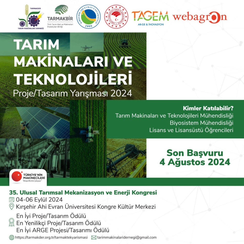 TARMAKDER Tarım Makinaları Derneği ve TARMAKBIR Türk Tarım Alet ve Makinaları İmalatçıları Birliği tarafından Kırşehir Ahi Evran Üniversitesi işbirliğinde düzenlenen "Tarım Makineleri ve Teknolojileri Proje/Tasarım Yarışması 2024" başvuruları başladı.