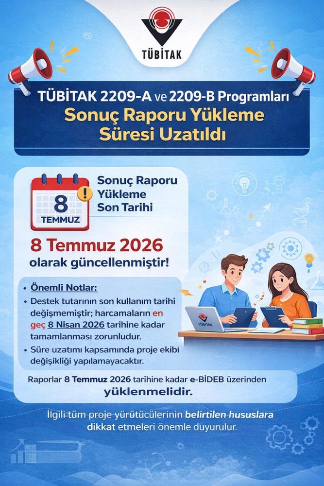 2024 yılı 1. dönem çağrısı kapsamında desteklenen projeler için sonuç raporu yükleme süresi 3 ay uzatılmış olup, yeni son tarih 08 Temmuz 2026 olarak belirlenmiştir. Proje yürütücülerinin raporlarını belirtilen tarihe kadar e-BİDEB sistemi üzerinden yüklemeleri gerekmektedir.