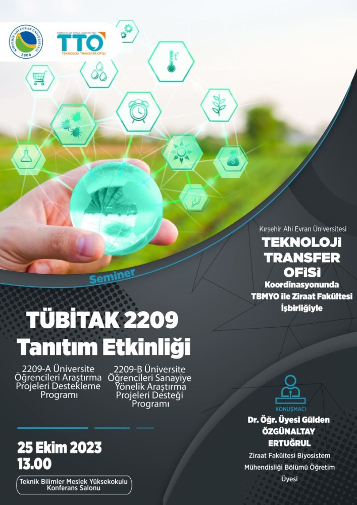 Kırşehir Ahi Evran Üniversitesi TTO koordinasyonunda Teknik Bilimler Meslek Yüksekokulu ve Ziraat Fakültesi işbirliğiyle 25 Ekim 2023 Çarşamba günü saat 13.00'da Teknik Bilimler Meslek Yüksekokulu Konferans Salonu'nda TÜBİTAK 2209-A Üniversite Öğrencileri Araştırma Projeleri Destekleme Programı ve 2209-B Üniversite Öğrencileri Sanayiye Yönelik Araştırma Projeleri Desteği Programı kapsamındaki proje çağrılarına yönelik yüz yüze seminer düzenlenecektir. Ziraat Fakültesi Dr. Öğr. Üyesi Gülden ÖZGÜNALTAY ERTUĞRUL'un konuşmacı olacağı etkinliğimize tüm öğrencilerimiz ve araştırmacılarımız davetlidir.