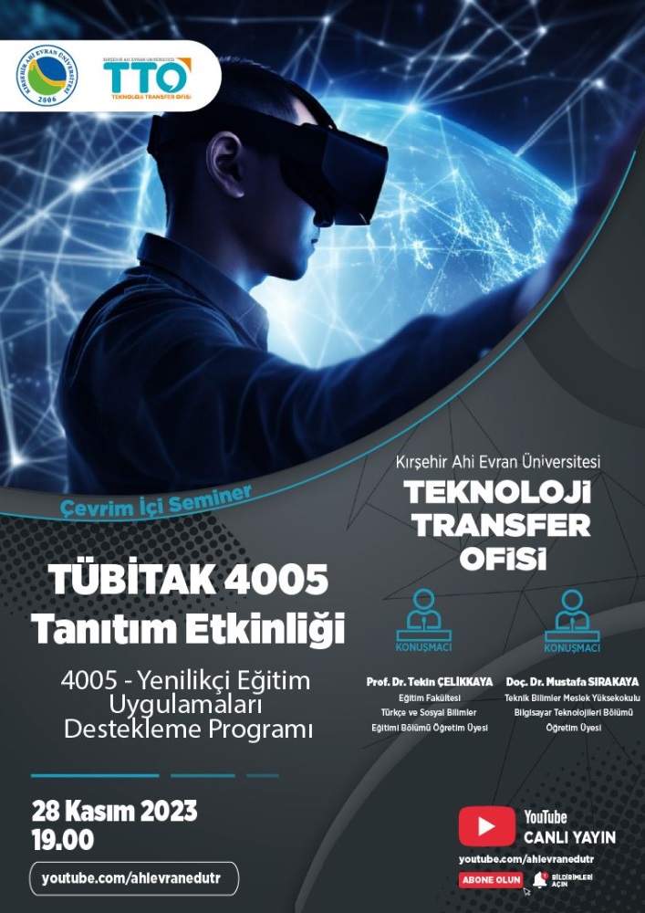 Kırşehir Ahi Evran Üniversitesi Teknoloji Transfer Ofisi UAM olarak "Proje Destekleri" modül çalışmalarımıza hız kesmeden devam ediyoruz! 28 Kasım 2023 Salı günü saat 19.00'da Üniversitemiz Youtube kanalında canlı olarak TÜBİTAK 4005 - Yenilikçi Eğitim Uygulamaları Destekleme Programı kapsamındaki proje çağrısına yönelik çevrimiçi seminer düzenlenecektir. Eğitim Fakültesi Türkçe ve Sosyal Bilimler Eğitimi Bölümü Öğretim Üyesi Prof. Dr. Tekin Çelikkaya ve Teknik Bilimler Meslek Yüksekokulu Bilgisayar Teknolojileri Bölümü Öğretim Üyesi Doç. Dr. Mustafa Sırakaya'nın konuşmacı olacağı etkinliğimize tüm öğrencilerimiz ve araştırmacılarımız davetlidir.