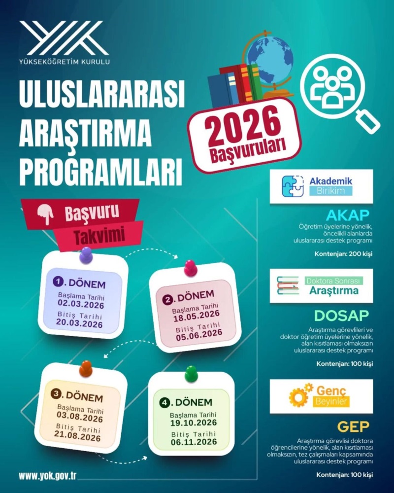 Yükseköğretim Kurulu (YÖK) tarafından yürütülen Uluslararası Araştırma Programları kapsamında 2026 yılı başvuru takvimi ilan edildi. Akademisyenler ve araştırmacılar için uluslararası iş birliklerini teşvik etmeyi amaçlayan programlar, dört ayrı başvuru dönemi halinde gerçekleştirilecek.