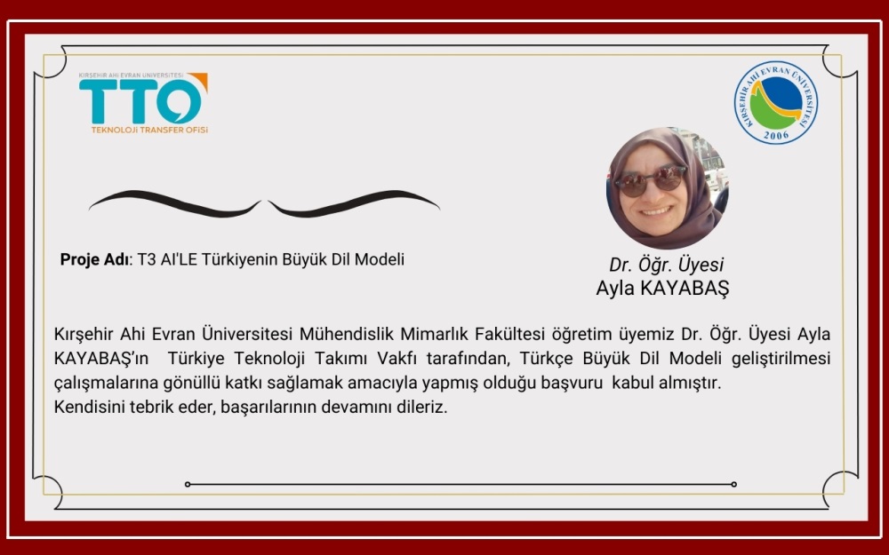 Kırşehir Ahi Evran Üniversitesi Mühendislik Mimarlık Fakültesi öğretim üyemiz Dr. Öğr. Üyesi Ayla KAYABAŞ’ın Türkiye Teknoloji Takımı Vakfı tarafından, Türkçe Büyük Dil Modeli geliştirilmesi çalışmalarına gönüllü katkı sağlamak amacıyla yapmış olduğu başvuru kabul almıştır.