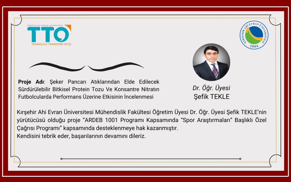 Kırşehir Ahi Evran Üniversitesi Mühendislik Fakültesi Öğretim Üyesi Dr. Öğr. Üyesi Şefik TEKLE’nin yürütücüsü olduğu "Şeker Pancarı Atıklarından Elde Edilecek Sürdürülebilir Bitkisel Protein Tozu Ve Konsantre Nitratın Futbolcularda Performans Üzerine Etkisinin İncelenmesi" proje “TÜBİTAK 1001 - Bilimsel ve Teknolojik Araştırma Projelerini Destekleme Programı