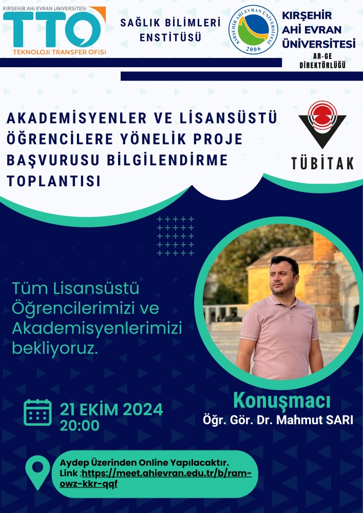 Kırşehir Ahi Evran Üniversitesi Sağlık Bilimleri Enstitüsü tarafından organize edilen ve AYDEP üzerinden online olarak verilecek olan "Proje Başvurusu Bilgilendirme Toplantısı"na tüm akademisyenlerimizi davet ediyoruz. Toplantı, akademisyenler ve lisansüstü öğrencilerin proje başvurularına yönelik bilgilendirme ve teşvik amacıyla düzenlenmektedir.