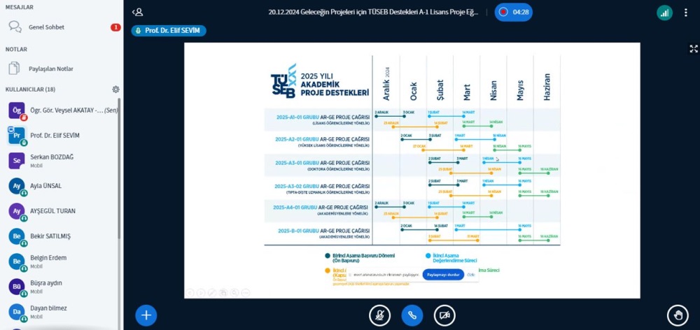 Bu seminerde, Prof. Dr. Elif Sevim tarafından Türkiye Sağlık Enstitüleri Başkanlığı’nın (TÜSEB) sunduğu destek programları hakkında detaylı bilgiler paylaşılırken, A-1 proje başvurularında başarılı olmanın ipuçları katılımcılarımıza aktarıldı. Etkinlik, lisans öğrencilerimize ve araştırmacılara rehberlik edecek şekilde tasarlandı ve projelerini geliştirmek isteyen tüm katılımcılara değerli bilgiler sundu.