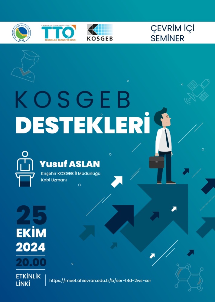 Kırşehir Ahi Evran Üniversitesi Teknoloji Transfer Ofisi tarafından, 25 Ekim 2024 Cuma günü saat 20.00'de KOSGEB desteklerine yönelik bir çevrimiçi seminer düzenlenecektir. Seminerde, KOSGEB Kırşehir İl Müdürlüğü'nden KOBİ Uzmanı Yusuf Aslan sunum yapacak.