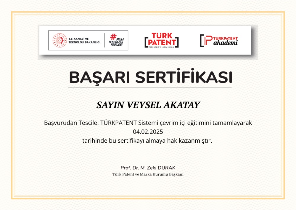 Kırşehir Ahi Evran Üniversitesi Teknoloji Transfer Ofisi olarak, TTO Uzmanımız Öğr. Gör. Veysel Akatay’ın "Başvurudan Tescile: TÜRKPATENT Sistemi" başlıklı çevrim içi eğitimi başarıyla tamamlayarak Türk Patent ve Marka Kurumu (TÜRKPATENT) tarafından verilen başarı sertifikasını almaya hak kazandığını memnuniyetle duyuruyoruz.