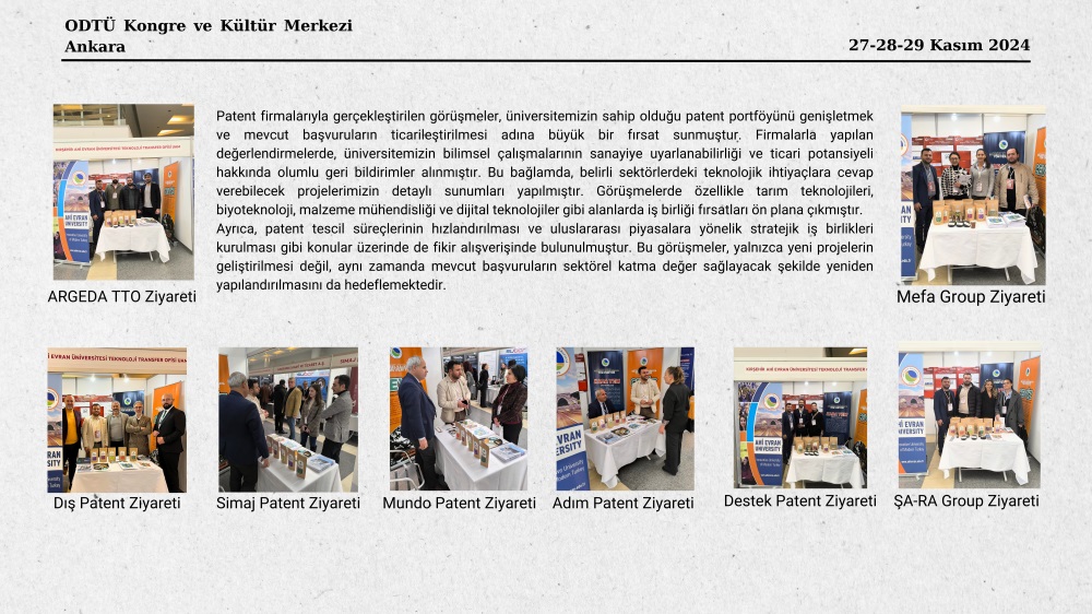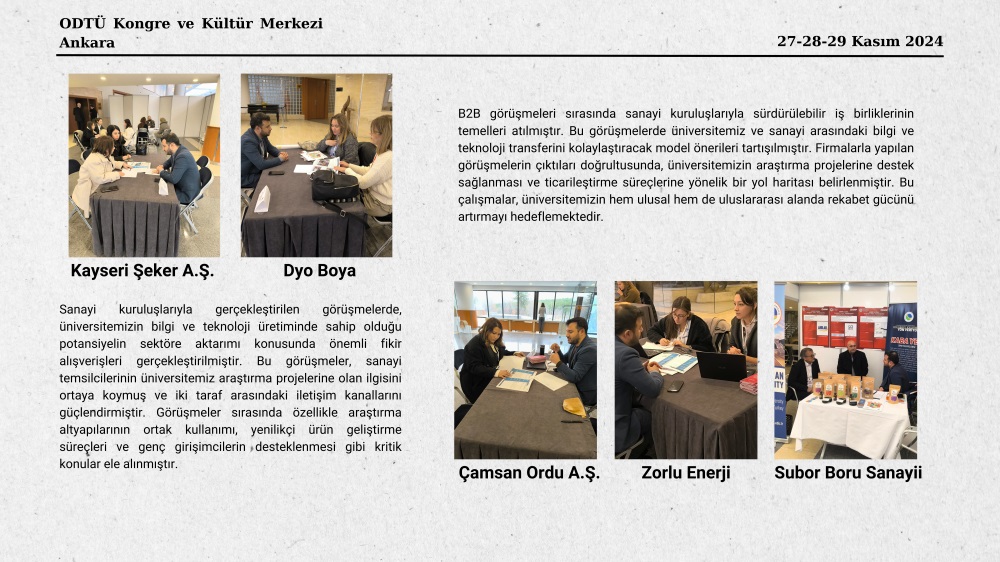 Üniversitemizin yenilikçi projelerini, akademisyenlerimizin yetkinliklerini ve patent portföyünü tanıtmak amacıyla açılan standımız, katılımcılar tarafından yoğun ilgi gördü. Sanayi kuruluşlarının temsilcileri, girişimciler, AR-GE merkezleri yönetici ve çalışanları, kamu kurumları ve yatırımcılar üniversitemizin AR-GE çalışmaları ve mevcut patent portföyü hakkında bilgi aldı. Fuarda gerçekleştirilen iş birliği toplantılarında, ticarileştirme süreçlerine yönelik görüşmeler yapılarak inovasyon odaklı projeler ele alındı. Etkinlik kapsamında Zorlu Enerji, Dyo Boya, Subor Boru Sanayii Tasarım Merkezi, Çamsan Ordu A.Ş., Kayseri Şeker gibi köklü 10’dan fazla firma ile birebir (B2B) görüşme gerçekleştirildi. Görüşmelerde, tarım teknolojileri, biyoteknoloji ve mühendislik ürünleri başta olmak üzere pek çok sektöre yönelik iş birliği fırsatları değerlendirildi.