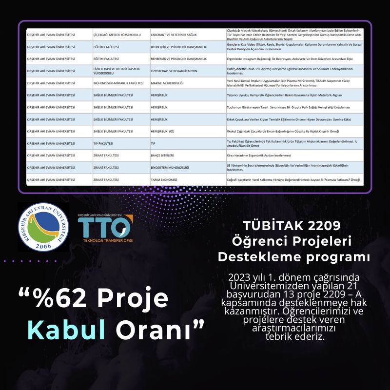 TÜBİTAK 2209 Öğrenci Projeleri Destekleme programı kapsamında 2023 yılı 1. dönem çağrısında Kırşehir Ahi Evran Üniversitesi'nden yapılan 21 başvurudan 13 proje 2209 – A kapsamında desteklenmeye hak kazanmıştır. Öğrencilerimizi ve projelere destek veren araştırmacılarımızı tebrik ederiz.