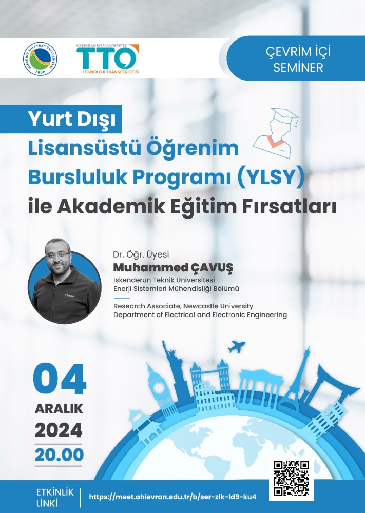 Kırşehir Ahi Evran Üniversitesi Teknoloji Transfer Ofisi UAM tarafından, 04 Aralık 2024 Çarşamba günü saat 20.00'de Yurt Dışı Lisansüstü Öğrenim Bursluluk Programına yönelik bir çevrimiçi seminer düzenlenecektir. Seminerde, YLSY bursluluk programından faydalanarak Newcastle Unıversity’de Research Associate olan, İskenderun Teknik Üniversitesi Enerji Sistemleri Mühendisliği Bölümü Dr. Öğr. Üyesi Muhammed ÇAVUŞ Bey sunum gerçekleştirecek.